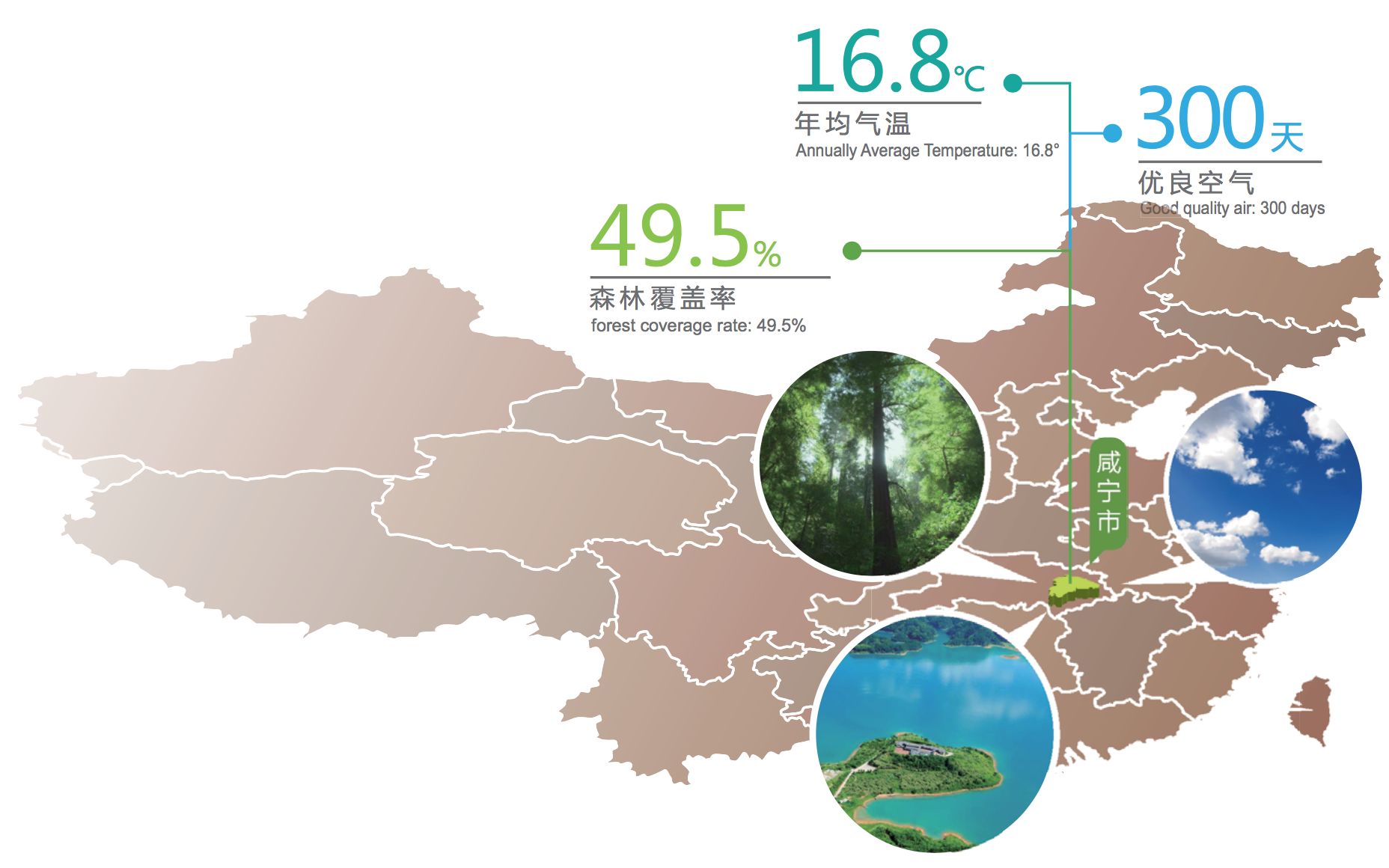 49.5%的森林覆盖率、38.5%的城市绿化覆盖率,全年300天以上的优良空气,山青、水秀、泉温、洞奇、桂香、竹翠的自然风光,成就了“中国亚热带森林自然生态平衡典型代表”、“全国最适宜人居城市”等美誉和“中国人居环境范例奖”等殊荣。